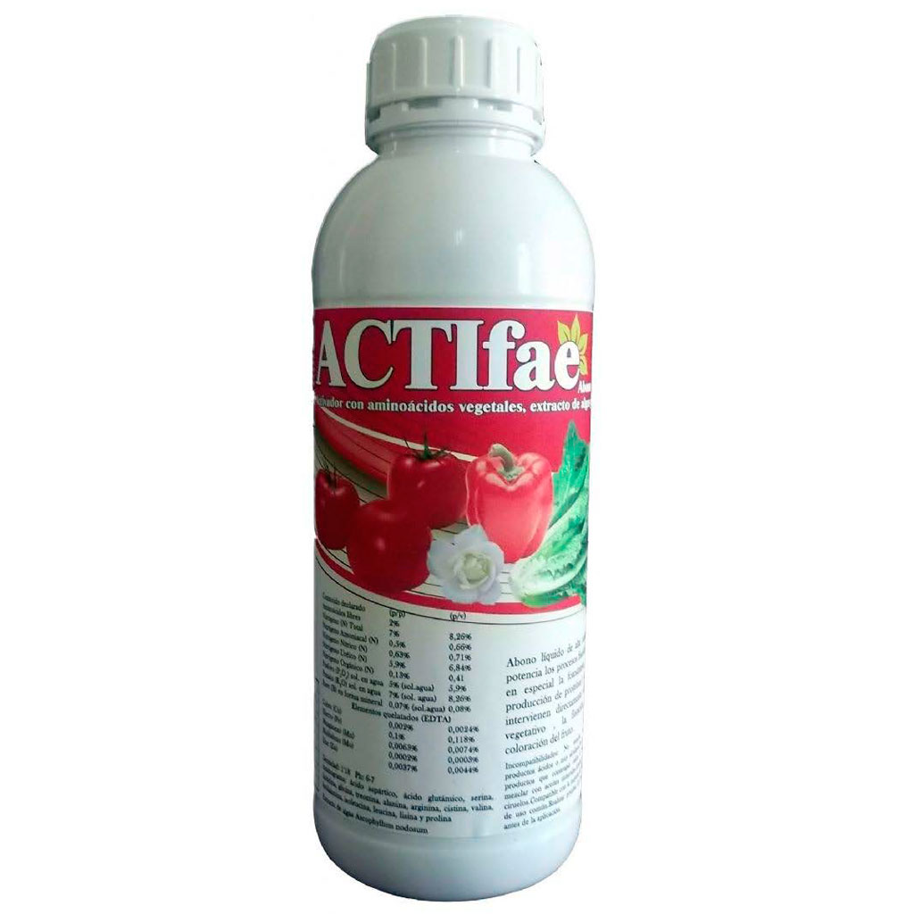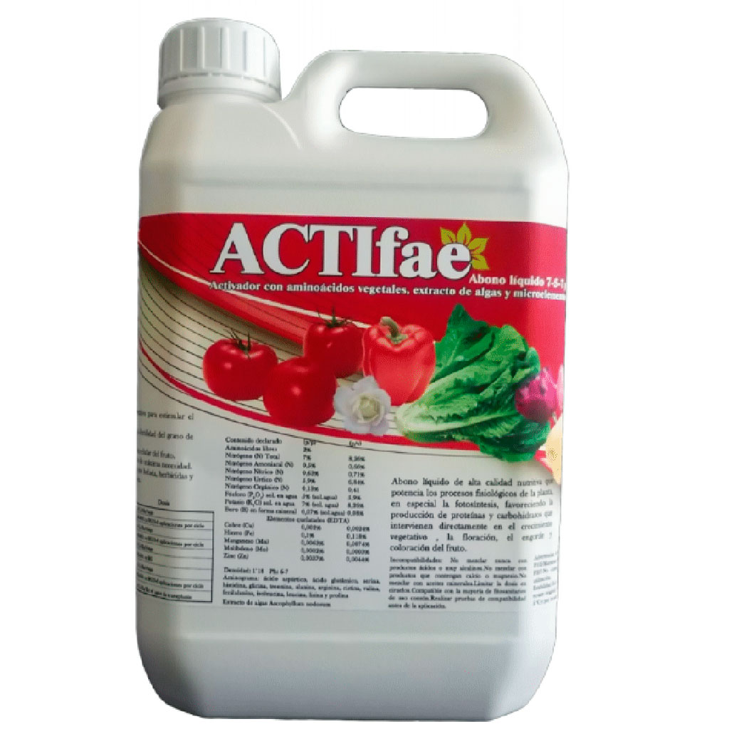 ACTIFAE es un abono líquido de alta calidad nutritiva que potencia los procesos fisiolígicos de la planta, en especial la fotosíntesis, favoreciendo la producción de proteínas y carbohidratos que intervienen directamente en el crecimiento vegetativo, la floración, el engorde y coloración del fruto.