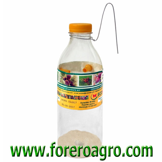 La trampa contiene 20 g de atrayente alimenticio en polvo para la atracción de machos y hembras de la mosca de la fruta Ceratitis capitata y otras moscas de la familia Tephritidae, para diluir en 500 ml de agua. La trampa se suministra con un colgador de alambre para suspenderla de una rama.