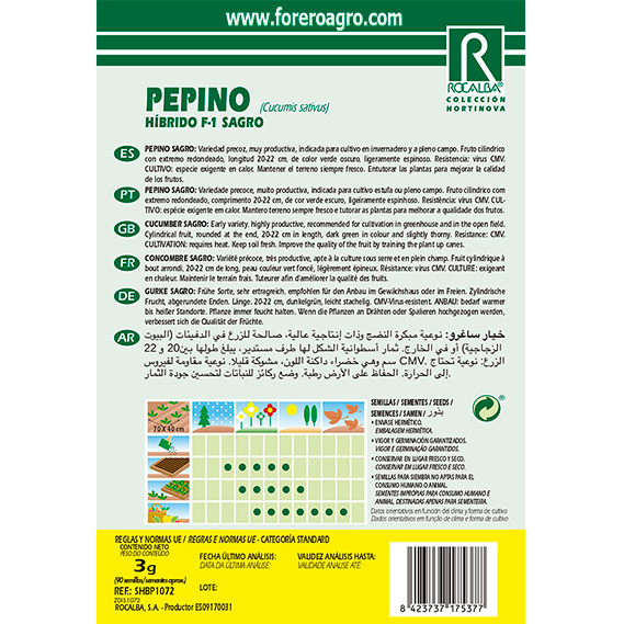 Variedad precoz, muy productiva, indicada para cultivo en invernadero y a pleno campo. Fruto cilindrico con extremo redondeado, longitud 20-22 cm‚ de color verde oscuro‚ ligeramente espinoso. Resistencia:virus CMV.